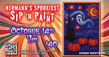 Join us for a ghostly paint & sip event! Paint “Starry Nightmare” a twist on 'Starry Night' by Van Gogh. Starts at 7 pm. Please RSVP here: https://buytickets.at/hermanns/1871871 and pay at the bar by October 6th.